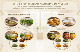 Diet is a crucial part of psoriasis treatment. Ayurveda emphasizes food that supports digestion and prevents toxin build-up.